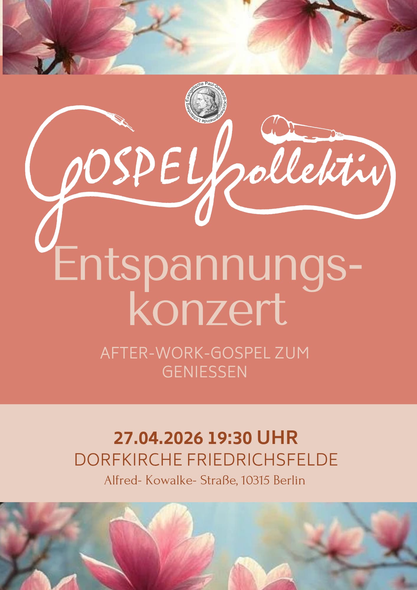 20 begeisterte Sängerinnen werden mit unserem Chorleiter-Duo bewegende und mitreisende Musikmomente liefern. Der Fokus diesmal: Entspannung Das After-Work-Konzert soll Sie entspannt - ohne Band und viel Technik - in die neue Woche begleiten. Freuen Sie sich auf meditative und kraftvolle Songs, die acappella oder auch mit Klavierbegleitung, neue Kraft für den Alltag spenden. Machen Sie die Augen zu, lehnen Sie sich zurück und genießen Sie Gospel mal anders! Seien Sie herzlich eingeladen und gönnen Sie sich einen entspannten Abend mit Musik für die Seele.
