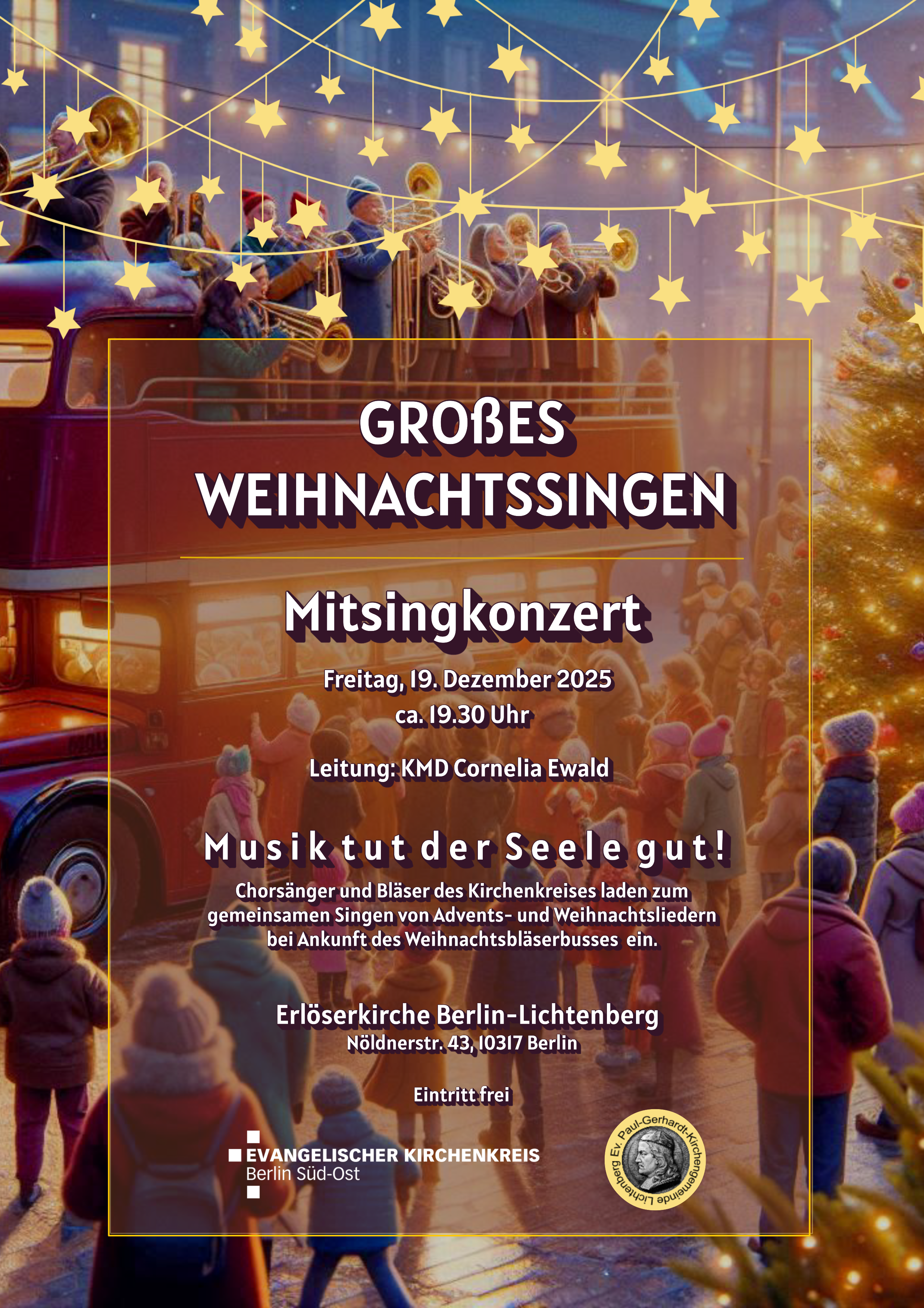 Der Weihnachtsbläserbus in Zusammenklang mit Chorsängern und Bläsern des Kirchenkreises laden zum gemeinsamen Singen von Advents- und Weihnachtsliedern ein.